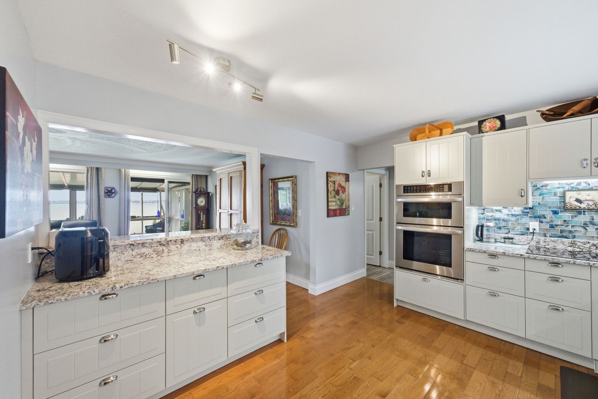 The main floor features an open-concept layout designed for lake views, including a spacious living room, sunroom and formal dining area oriented toward the water. The chef’s kitchen showcases EXQUISITE GRANITE countertops, premium LG stainless appliances, double wall ovens, cooktop, breakfast bar seating and uninterrupted lake views. Main level also includes 2 bedrooms, full bath with soaker tub, and convenient laundry/pantry.